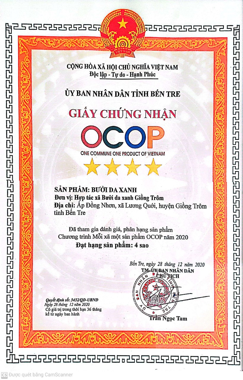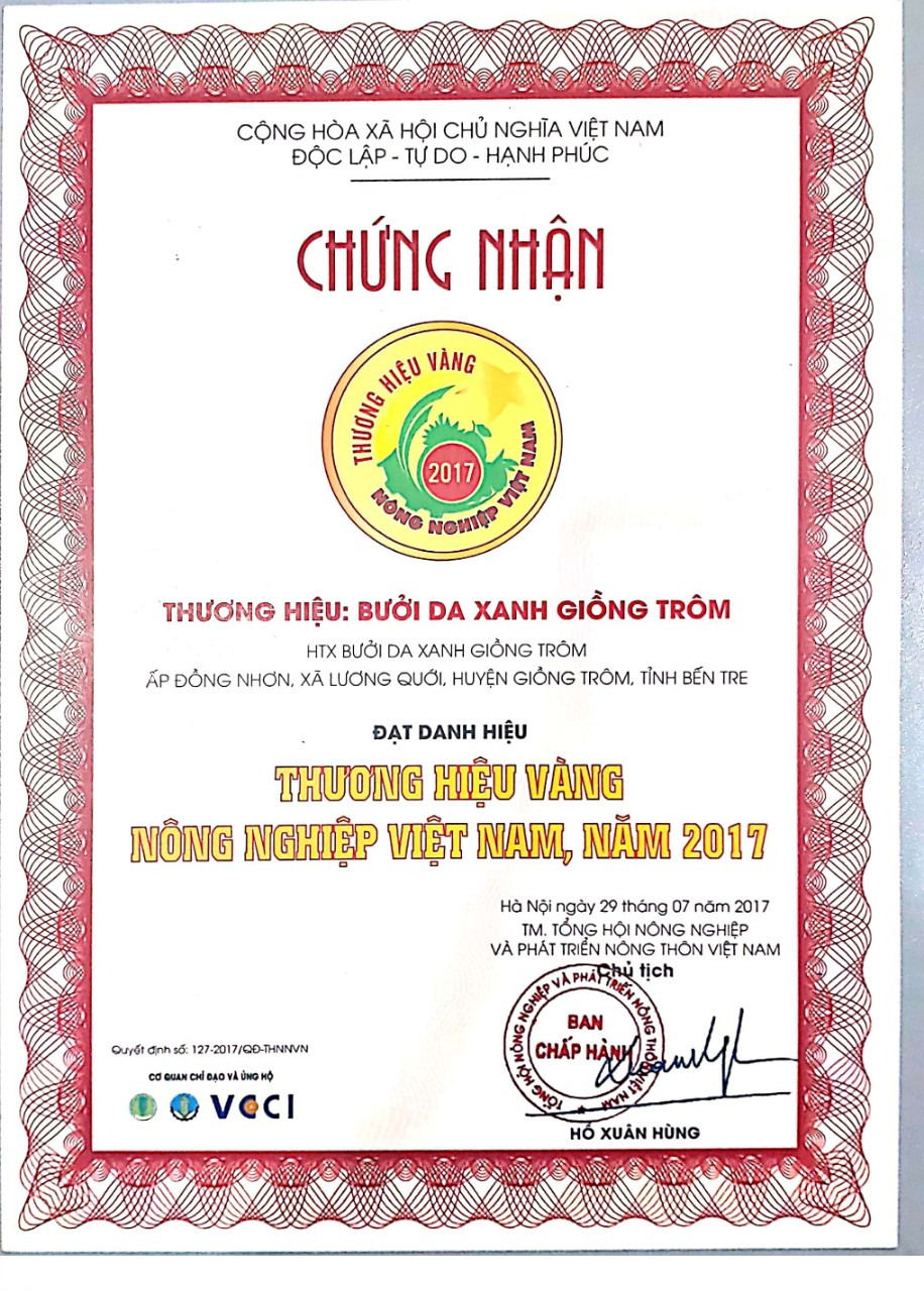 Đầu năm 2018, sản phẩm bưởi da xanh Bến Tre được Cục sở hữu trí tuệ Bộ Khoa học và Công nghệ cấp chứng nhận đăng ký chỉ dẫn địa lý số 00062. Cũng trong năm 2018, Hợp tác xã Bưởi da xanh Giồng Trôm vinh dự là một trong 2 hợp tác xã điển hình trong tổng số hơn 13 ngàn HTX trong toàn quốc được Bộ Kế hoạch và Đầu tư tuyên dương khen thưởng trong phong trào thi đua Ngành kế hoạch, đầu tư và thống kê chung sức xây dựng nông thôn mới giai đoạn 2016-2020./.